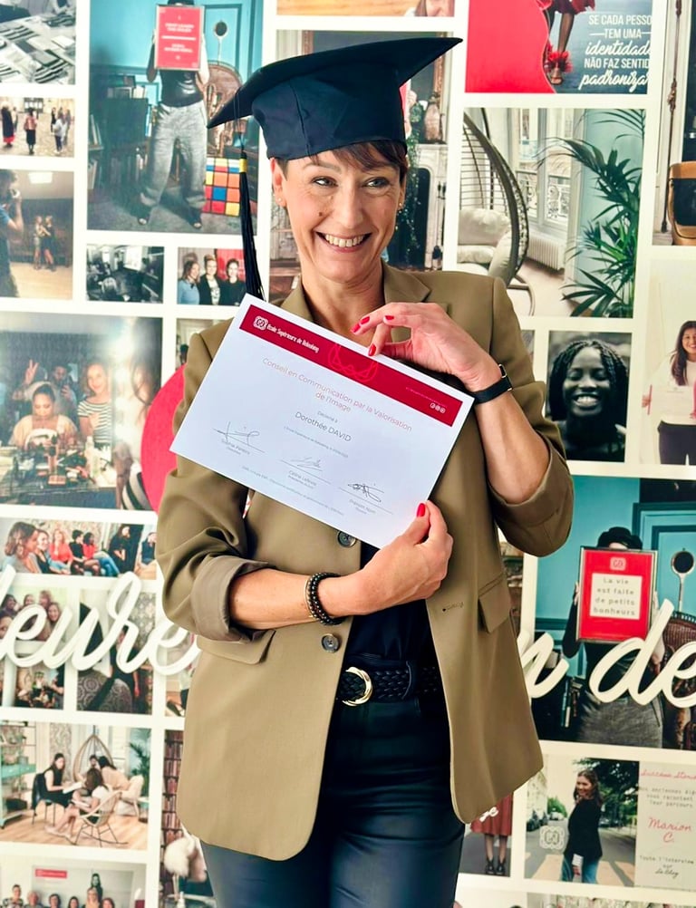 Aujourd'hui, certifiée Conseillère en Communication par la valorisation de l'image, j’aide celles et ceux qui souhaitent renaître et se sentir alignés avec l’image qu’ils renvoient.